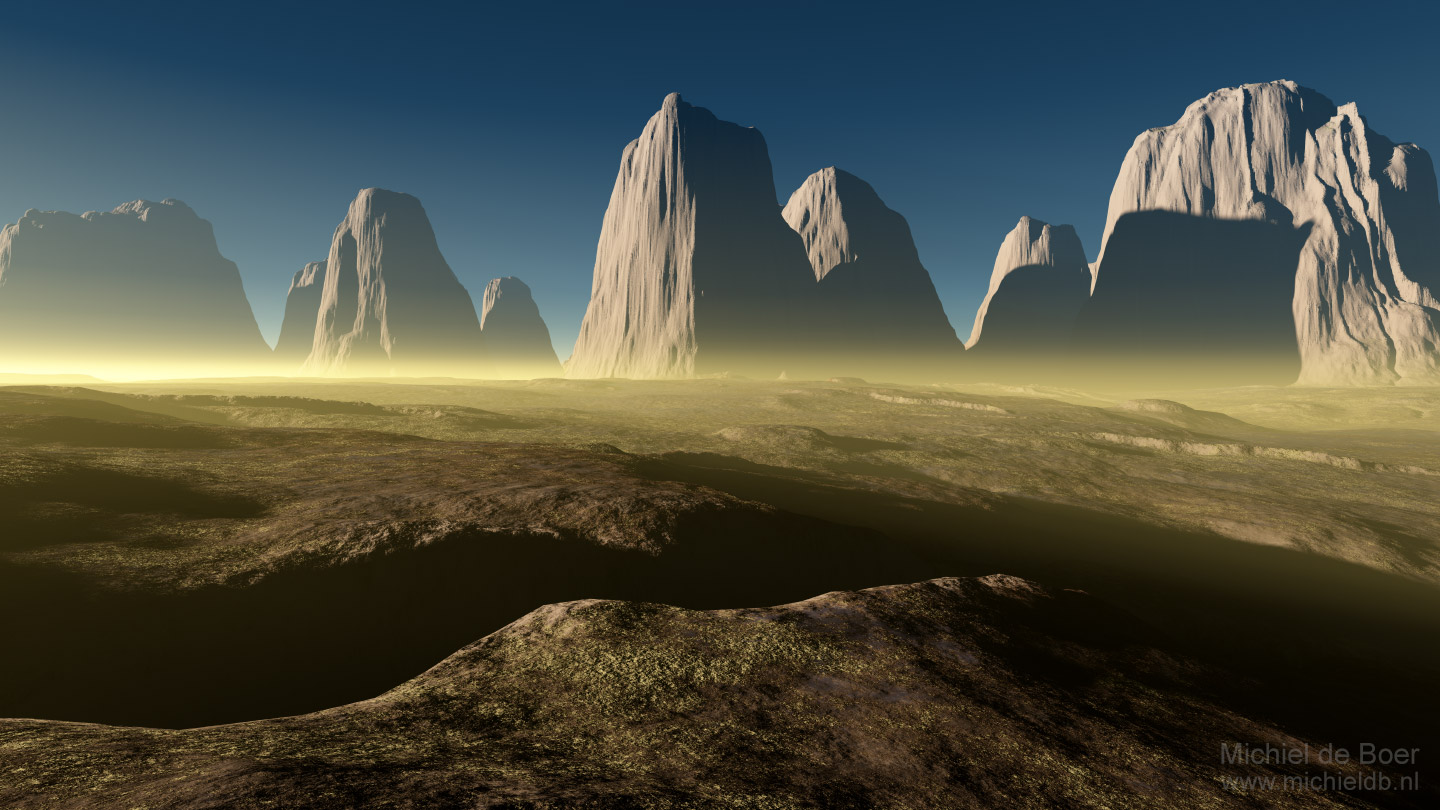Van 2001 tot 2005, was ik een bedreven Terragen 'kunstenaar'. Het maken van deze virtuele landschappen ging lanzaam over in het fotograferen van echte landschappen... In 2022-23 deed ik dat nog eens over in versie 0.9. Deze pagina is niet up to date, de meeste recente afbeeldingen vind je op deze antieke pagina.